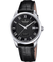 Черный циферблат с римскими цифрами и делениями создает четкую и легко читаемую разметку, а индикация даты добавляет удобства в повседневном использовании. Кожаный ремешок черного цвета не только комфортно сидит на запястье, но и подчеркивает классический стиль модели. Диаметр 39,5 мм делает часы универсальными, подходящими для большинства размеров запястья, а круглая форма усиливает их традиционный внешний вид.